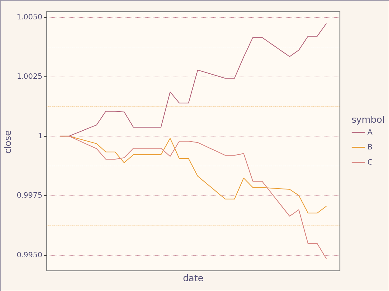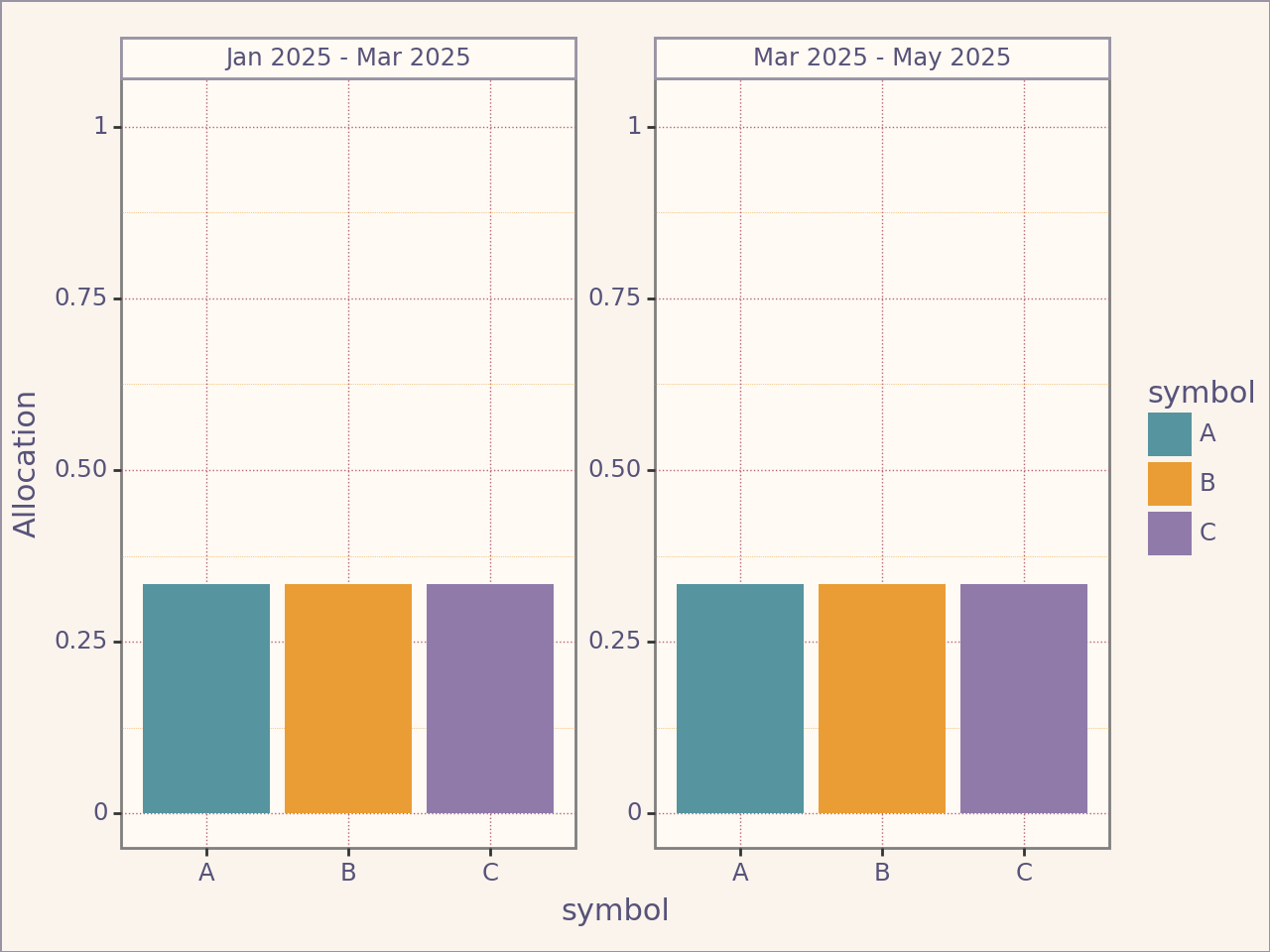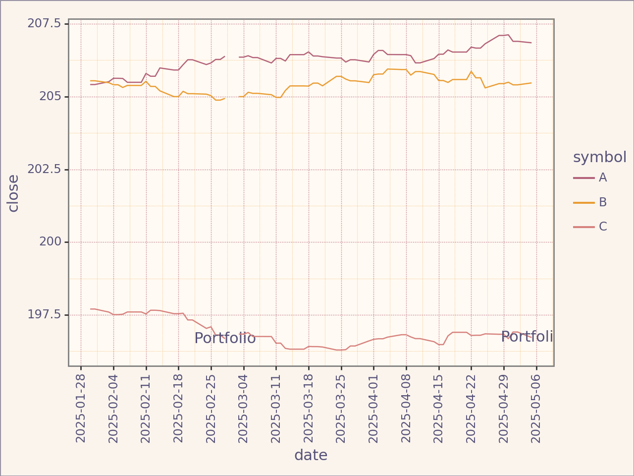 Let’s define our plan. We are interested in knowing what we would have earned if we invested equal weights in companies A, B and C. Starting on January up to today (2025-05-02).